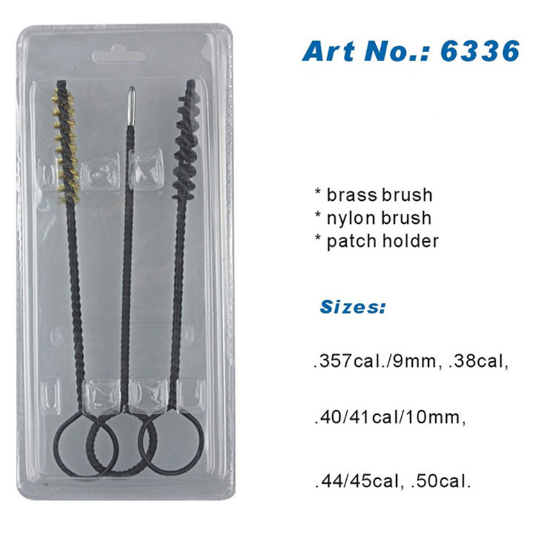 کیت تمیز کننده تفنگ دستی 3 عددی، بسته بندی شده در دو تاول. یک برس تمیزکننده سوراخ برنجی، یک برس تمیزکننده سوراخ نایلونی و یک نگهدارنده وصله شکافدار. مفید و موثر.