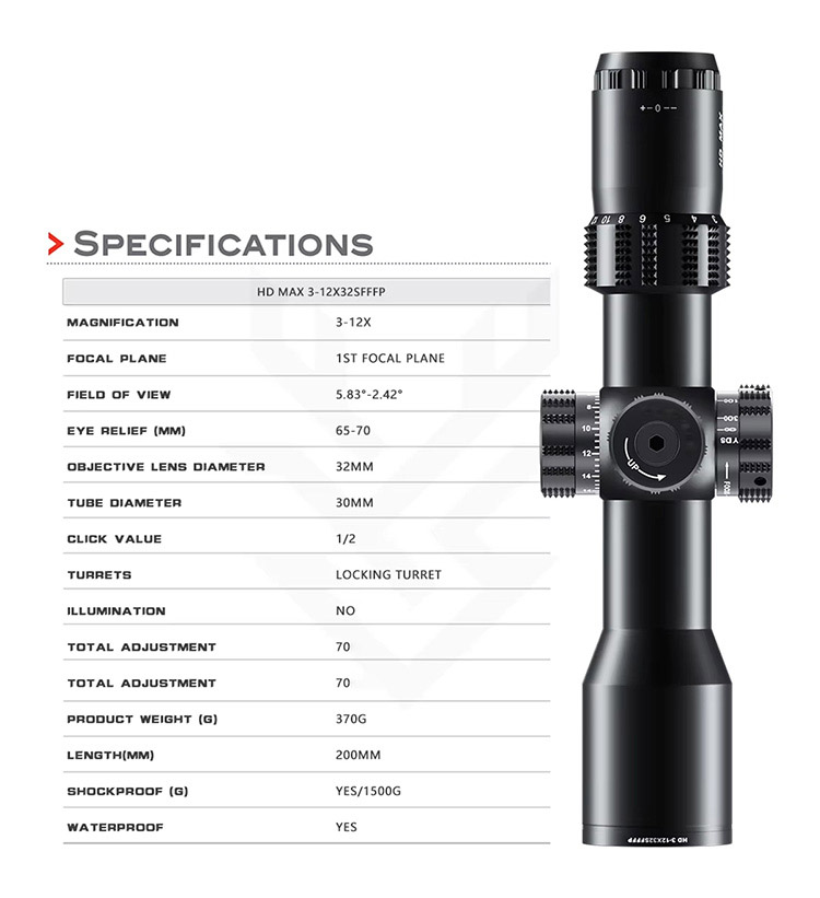 فروش عمده تلسکوپ تک چشمی شکار با لنز بالا MAX 3-12X32SF FFP HD