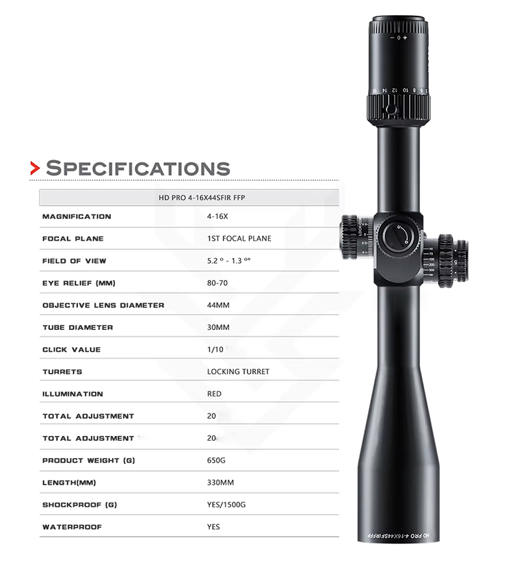 Optics HD PRO 4-16X44 SFIR FFP با مقاومت در برابر شوک بالا لوله 30 میلی متری تیراندازی طولانی مدت تاکتیکی